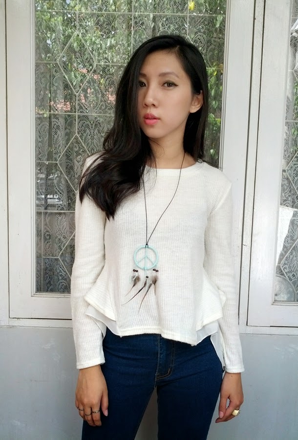 Feeling a lil' bit girly that day, all about white and blue, so I'm wearing this kinda top with a lovely detail of soft layer on the back side, and another reason why I love this top is the soft knit fabric, so comfy to wear. Paired with high waist jeans, a lil' dream catcher necklace and the touch of blue from my shoes.